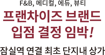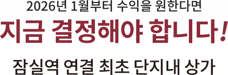 2026년 1월수익 실현 F&B, 메디컬, 에듀, 뷰티 프랜차이즈 브랜드 입점 결정 임박! 잠실역 연결 최초 단지내 상가 2026년 1월부터 수익을 원한다면 지금 결정해야 합니다! 잠실역 연결 최초 단지내 상가 SCROLL DOWN 매일 6만 명, 잠실 최대 상권! MZ에서 실버세대까지 모든 세대가 몰려온다! TRAFFIC INFRA EDU LIFE 04 CF VIDEO | 홍 보 관 | 서울특별시 송파구 오금로 87, 잠실리시온 네이버 지도 카카오 지도 | 현 장 | 서울특별시 송파구 올림픽로33길 17 네이버 지도 카카오 지도